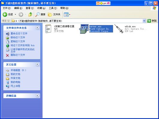 三個(gè)文件中的udisk.exe是某公司出品的U盤免疫程序,而其中的server.exe卻是一只灰鴿子,黑客通過安裝說明來誘導(dǎo)用戶,關(guān)閉殺毒軟件,以實(shí)現(xiàn)灰鴿子的順利“起飛”。