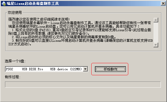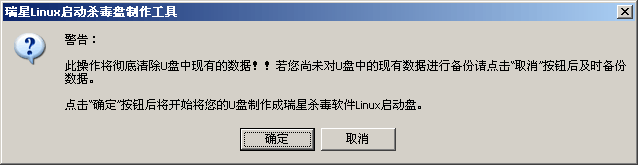重要聲明:此工具在制作過程中將徹底清除USB盤中的原有數(shù)據(jù),請(qǐng)您確認(rèn)在開始制作瑞星引導(dǎo)殺毒U盤之前您已經(jīng)對(duì)USB盤中的所有數(shù)據(jù)進(jìn)行了有效備份!
