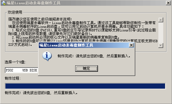 步驟6:當(dāng)整個(gè)制作過程完成您將看到如下圖的提示,點(diǎn)擊“確定”按鈕結(jié)束制作過程。至此您的U盤已經(jīng)制作為瑞星引導(dǎo)殺毒U盤,您可以使用該盤來引導(dǎo)計(jì)算機(jī)進(jìn)行查殺病毒操作了。