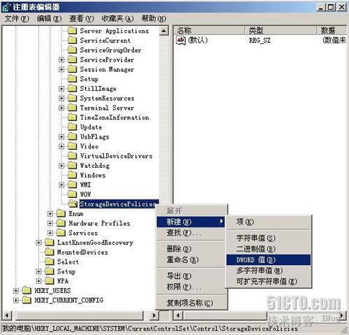 如下圖所示,在新建的StorageDevicePolicies下選擇新建一個DWORD值,DWORD值的名稱為WriteProtect。