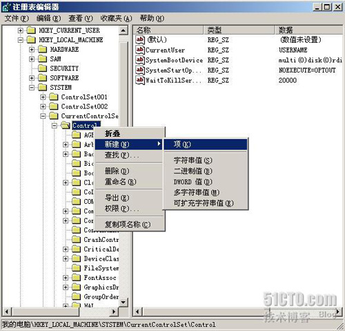 我們在一臺XP SP2的計算機上來為大家演示如何實現只讀U盤的制作,在計算機上運行Regedit,如下圖所示,我們在HKEY_LOCAL_MACHINE\SYSTEM\Current\ControlSet\Control下選擇新建一項,項的名稱為StorageDevicePolicies。