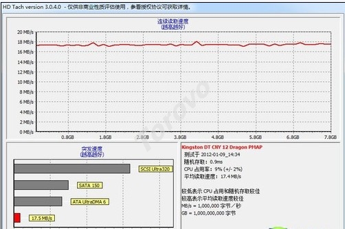 金士頓龍年生肖優盤在HD Tach測試軟件下,數據表現很不錯,平均速度達到17.4MB/S,突發速度17.5MB/S,傳輸很穩定。這是產品性能理論值的體現,具體性能我們來看一下其他測試。禮品U盤定做