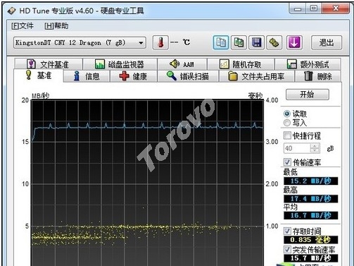 金士頓龍年生肖優盤在該軟件下的讀取表現為:最低傳輸率15.2MB/S,最高傳輸17.4MB/S,平均傳輸率16.7MB/s,數據訪問時間為0.835ms。這個數據在目前市場上銷售的USB2.0 優盤中成績很不錯。其上下限的差值很小,更體現了該產品在傳輸過程中具有很強的穩定性。深圳最大的U盤廠家