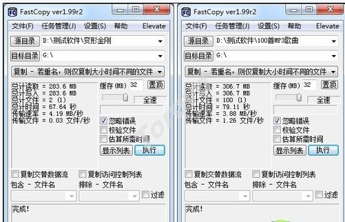 FastCopy是個小巧的文件/目錄拷貝工具,其功能強大,性能優越,能充分挖掘文件系統和硬盤驅動器的能力,并且支持計數和計時。這里使用一個是包含1個視頻文件總計容量為283.6MB的《變形金剛》MP4視頻剪輯文件,反應對大容量單個文件的實際拷貝能力;另一個文件夾包含100首MP3歌曲,總計容量為306.7MB,用來反映優盤應對零散文件拷貝能力。U盤定做,U盤定制