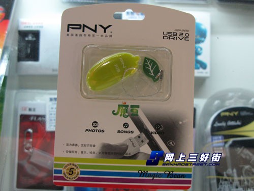 PNY的這款Magic Bean魔豆依然采用了PNY一貫的包裝設(shè)計(jì),不過在包裝底部有五種顏色的彩虹條,以此來表明這款U盤有五種顏色可選,分別對(duì)應(yīng)2G到16G的不同容量,本次到貨三好街的是萊姆綠色的2G容量產(chǎn)品,非常的清新自然,PNY將搞怪也發(fā)揮到了極致。